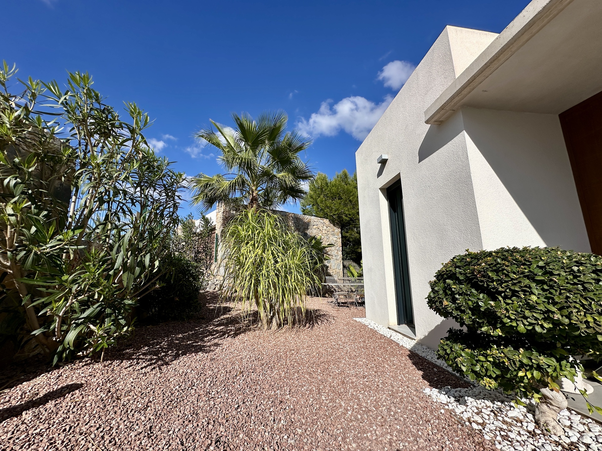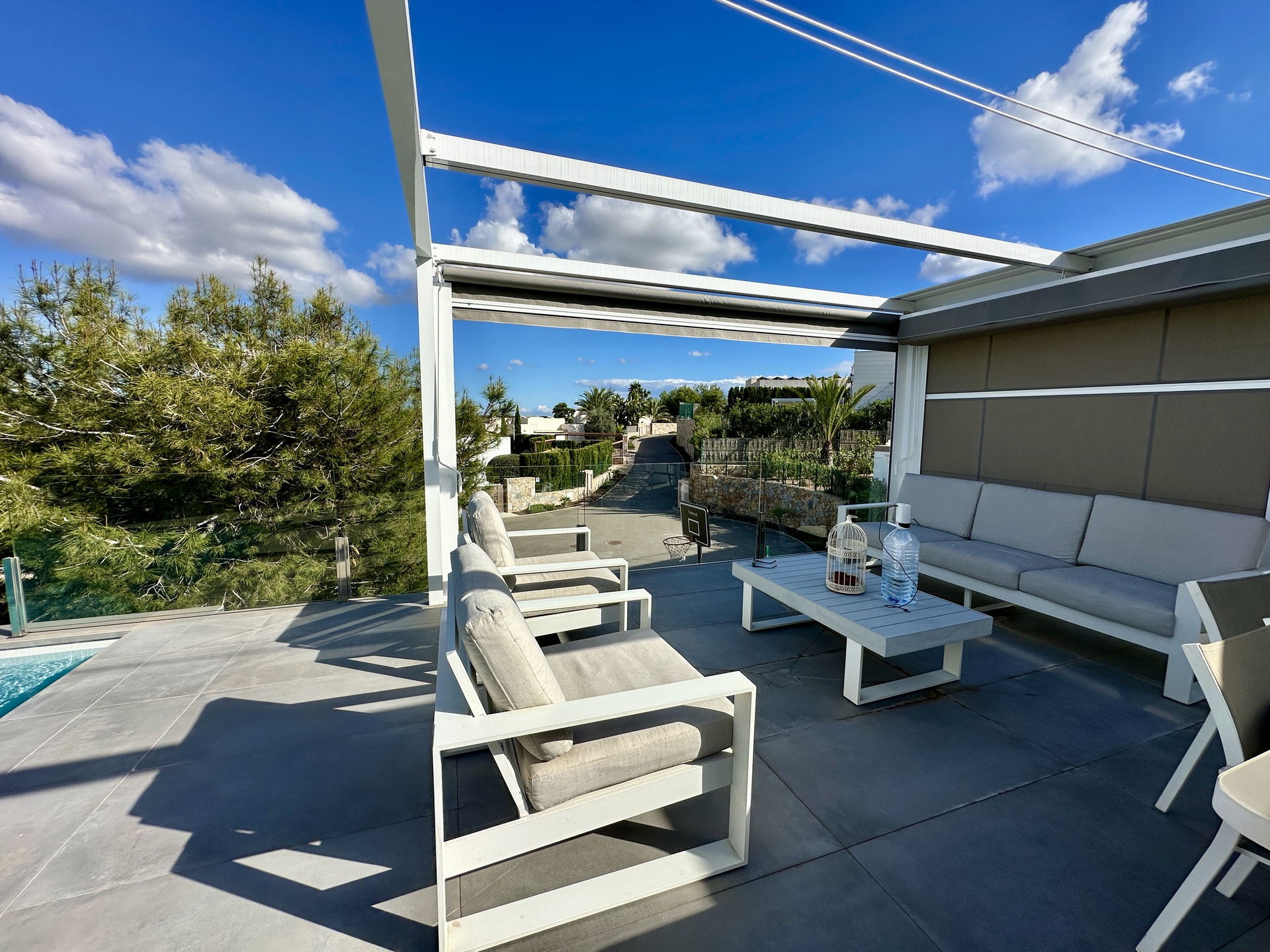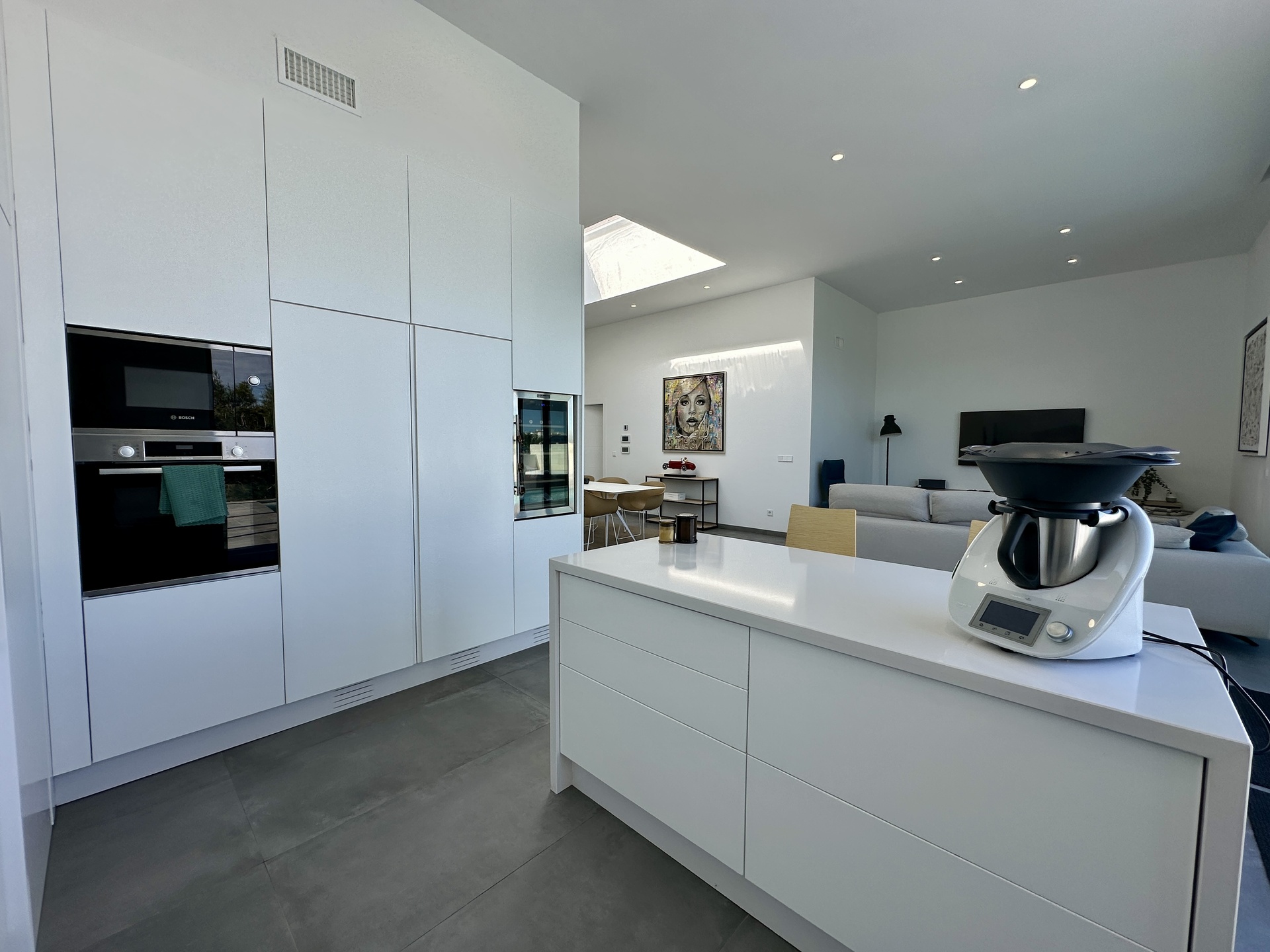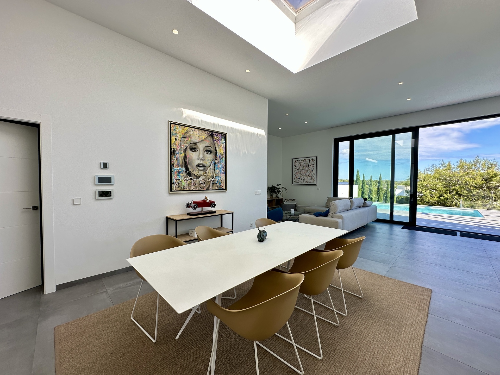 Step inside to be welcomed by soaring ceilings and an abundance of natural light. A striking picture window seamlessly blends the interior living space with an expansive 87 m² south-facing terrace, showcasing a 10-meter heated saltwater pool with tranquil views over the pine trees.